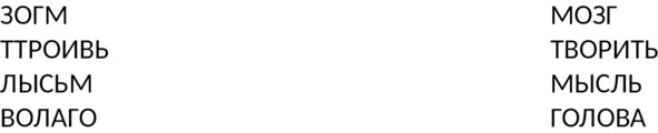 2. Составьте из букв четыре слова. У вас есть четыре набора букв, они могут нести какой-то смысл, а могут быть и бессмыслицей. Но если вы напряжетесь и откроете в своем сознании «базу данных», то ваша память сработает очень быстро и бессмысленные наборы букв станут словами.