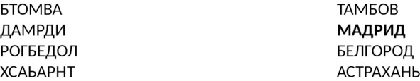 3. Отметьте город, расположенный не на территории России. Нужно совсем немного времени, чтобы наше сознание вычленило нужное название города. Оно открывает «базу данных», то есть активизирует память, и ответ найден. Сознание всего лишь «поймало» город, который не вписывается в общий ряд, выполнило поставленную задачу и не стало вникать в другие названия.