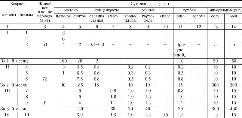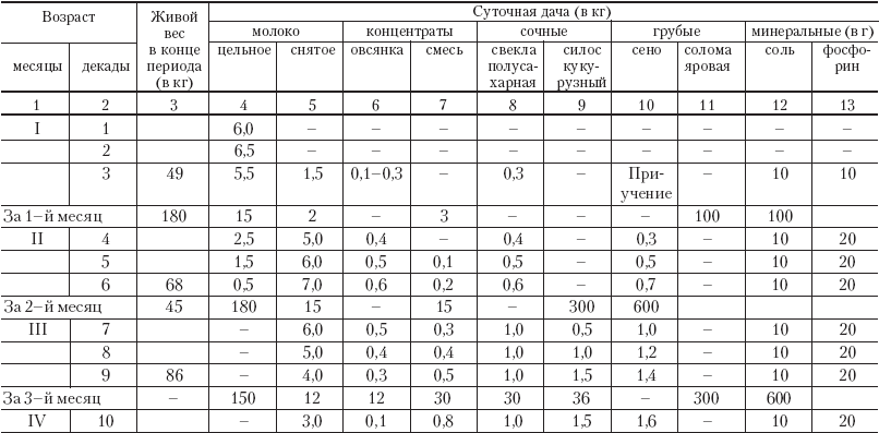 С двух– трехнедельного возраста телятам начинают давать просеянную овсянку, а со второго месяца в их рацион вводят смесь концентрированных кормов (овсянка 30–50%, отруби пшеничные – 20–30, жмых подсолнечный – 30–40%).