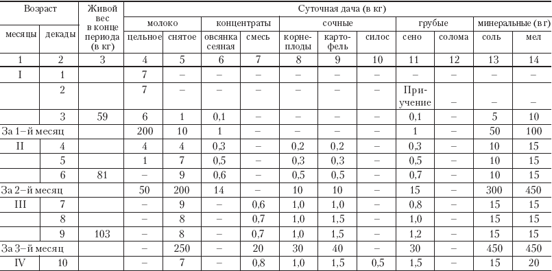 Ацидофильная простокваша. Готовится из молока здоровых коров и чистой ацидофильной культуры (палочки). Полученную простоквашу используют как диетический и лечебно-профилактический корм при желудочно-кишечных заболеваниях животных. Ее можно смешивать с молозивом, молоком и скармливать новорожденным телятам. Примерные суточные нормы простокваши: в первый день – 100 мл, второй – 150, третий – 200, четвертый – 250, пятый-седьмой – 300–400, восьмой-десятый – 500–600, одиннадцатый-четырнадцатый – 700, после 20 дней – 900 мл.