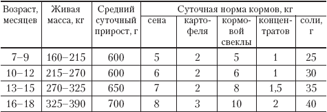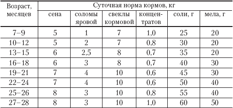 После шести месяцев рационы молодняка постепенно приближаются к структуре рационов крупного рогатого скота: для телочек доля концентрированных кормов сокращается, для бычков увеличивается. Основным кормом для телочек в стойловый период являются хорошее сено, кукурузный силос, кормовая свекла. В 8–10 месяцев в их рацион можно включать хорошую яровую солому. Ею можно компенсировать 30–40% потребности сена.