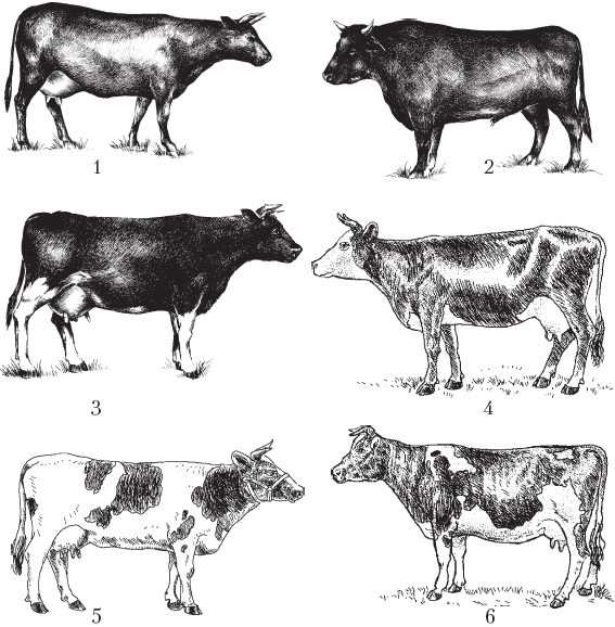 Молочные породы коров: 1 – красная степная; 2 – бык красной степной породы; 3 – черно-пестрая; 4 – ярославская; 5 – холмогорская; 6 – голштино-фризская