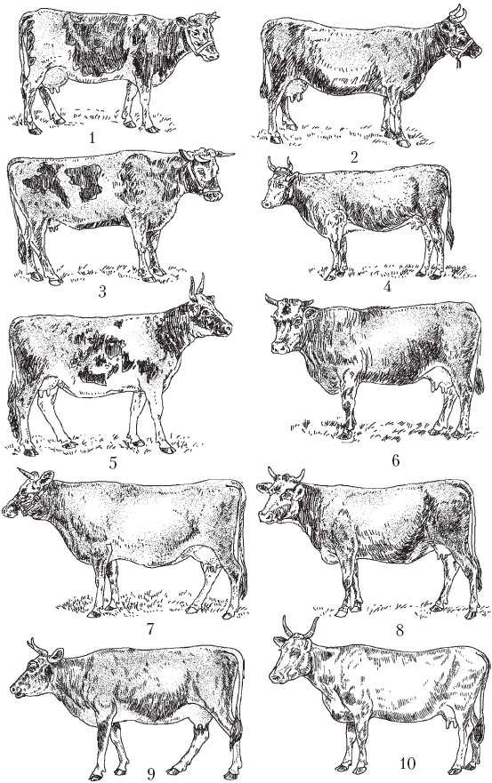 Молочные породы коров: 1 – голландская; 2 – англерская; 3 – нормандская; 4 – бретонская; 5 – айрширская; 6 – швицкая; 7 – джерсейская; 8 – альгауская; 9 – великорусская ярославская; 10 – великорусская смоленская