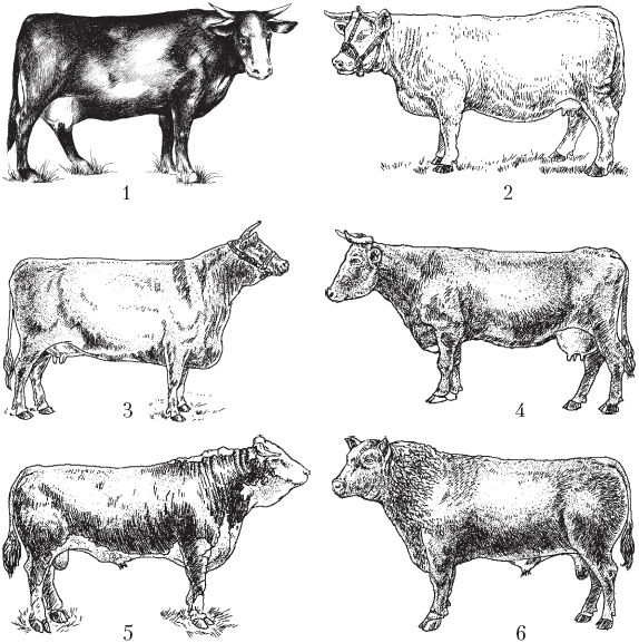 Мясные породы коров: 1 – украинская; 2 – шароле; 3 – шортгорн; 4 – бестужевская; 5 – бык герефордской мясной породы; 6 – бык мясной породы Абердин-ангус