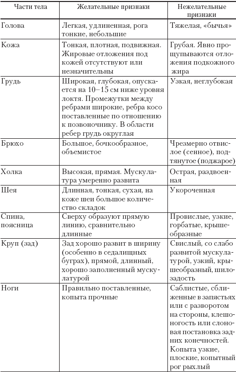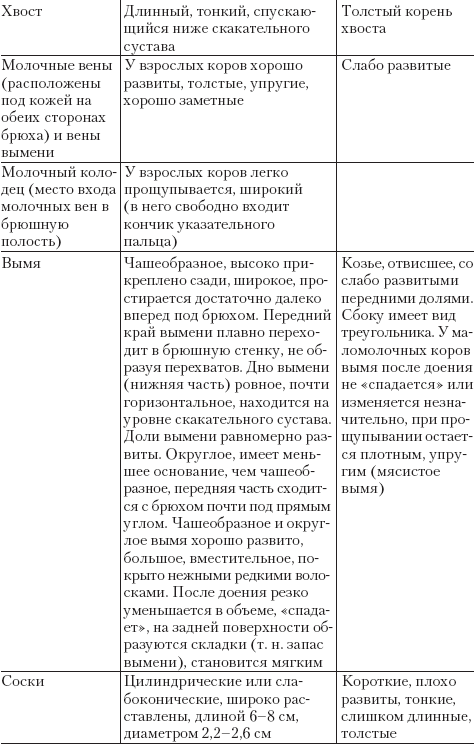 Точным критерием оценки будущей молочной продуктивности телки и дойной коровы является анализ документационных данных об их происхождении: породности родителей, их продуктивности, продуктивности сестер и т. п. Однако такие данные получить не всегда представляется возможным. Поэтому приходится отбирать животных по внешнему виду. Показатели желательных признаков приведены в таблице.