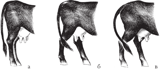 Форма вымени коров: а – чашеобразное вымя; б – округлое вымя; в – козье вымя