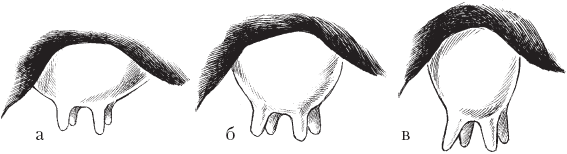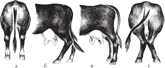Форма зада у коров: а – корова с приподнятым крестцом; б – зад прямой, хорошо заполнен мускулатурой; в – зад свисший, со слабо развитой мускулатурой