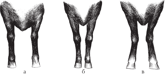 Постановка задних ног: а – широкая и правильная постановка; б – саблистая постановка; в – прямая и слоновая постановка; г – иксообразная постановка