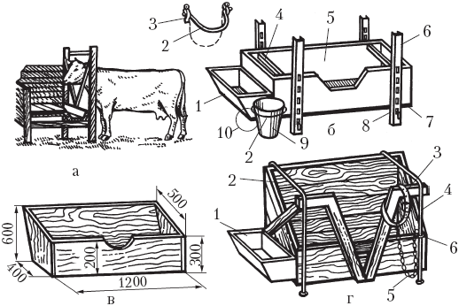 Кормушки для крупного рогатого скота: а – общий вид кормушки; б – кормушка с регулируемой высотой: 1 – боковое корыто; 2, 3 – загнутый прутик; 4 – перекладина; 5 – кормушка; 6 – стояк; 7 – отверстия; 8 – стопор; 9 – ведро; 10 – ушко держателя ведра; в – наземная кормушка; г – кормушка-привязь: 1 – боковое корыто; 2 – кормушка; 3 – ошейник; 4 – стояк; 5 – цепь; 6 – скоба