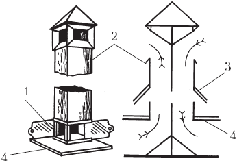 Вентиляционная труба: 1, 3 – заслонки; 2 – шахта; 4 – площадка