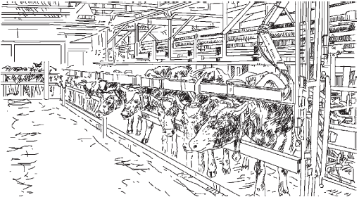 Выгульные дворы устраивают вдоль продольных стен коровника или относят на определенное расстояние и совмещают их с летним лагерем. Норма площади выгульного двора – из расчета 8 м2 твердого покрытия или 20–25 м2 без него. На выгулах устраивают кормушки (из расчета фронта кормления 0,8 м), теневые навесы.