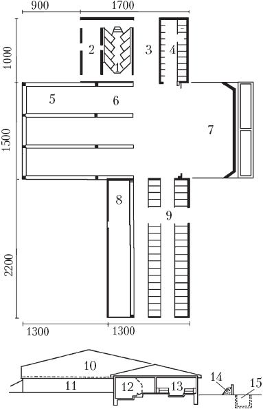 Схема фермы для беспривязного содержания крупного рогатого скота: 1 – доильное отделение; 2 – хранение молока; 3 – помещение для ожидания; 4 – боксы для телят; 5 – наземный силос; 6 – автокормушки; 7 – площадка для коров; 8 – беспривязное содержание молодняка; 9 – боксы для молочных коров; 10 – сено; 11 – наземный силос; 12 – беспривязное содержание молодняка; 13 – боксы для лежания; 14 – навоз; 15 – навозная жижа