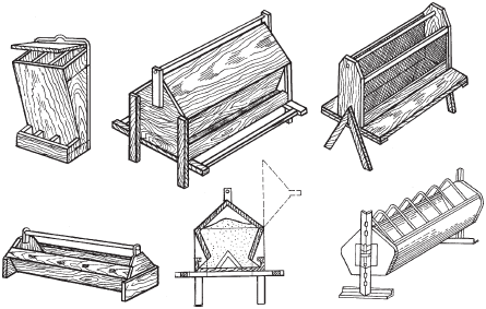 Для скармливания зеленой массы в выгульных двориках навешивают V-образные кормушки с решетчатой боковиной.