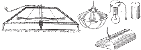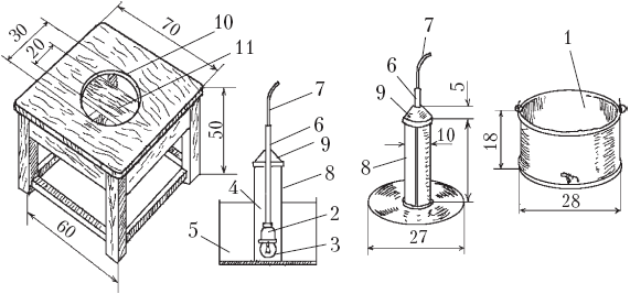 Поилка с электрообогревом: 1 – оцинкованное ведро; 2 – патрон для электролампы; 3 – лампа мощностью 10 ватт; 4 – сухой песок; 5 – вода; 6 – шланг резиновый; 7 – электропровод; 8 – цилиндр из оцинкованной листовой стали (швы пропаяны); 9 – крышка съемная из оцинкованной листовой стали; 10 – гнездо для ведра; 11 – подставка для ведра (доска, прибитая гвоздями к крышке столика)