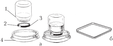 Кормушки и поилки для цыплят: а – вакуумная поилка: 1 – емкость для воды; 2 – отверстие для вытекания воды; 3 – подставка; 4 – миска; б – лотковая кормушка