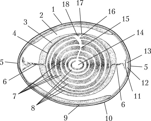 Строение куриного яйца (продольный разрез): 1 – наружный жидкий белок; 2 – плотный белок; 3 – внутренний жидкий белок; 4 – градинковый слой; 5 – белковая связка; 6 – градинки; 7 – темный желток; 8 – светлый желток; 9 – надскорлупная пленка; 10 – скорлупа; 11 – воздушная камера; 12 – подскорлупная оболочка; 13 – яичная оболочка; 14 – латебра; 15 – шейка латебры; 16 – ядро Пайдера; 17 – желточная оболочка; 18 – бластодиск