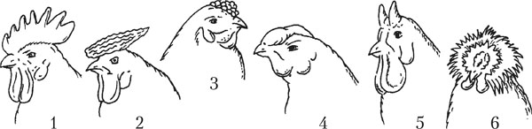 Форма гребней: 1 – листовидный; 2 – розовидный; 3 – стручковидный; 4 – ореховидный; 5 – роговидный; 6 – бабочковидный