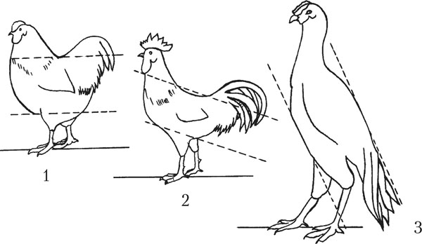 Постав тела кур: 1 – горизонтальный; 2 – наклонный; 3 – выпрямленный (вертикальный)