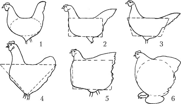 Типы туловища кур: 1 – яйцевидное; 2 – прямоугольное; 3 – трапециевидное; 4 – треугольное; 5 – квадратное; 6 – шаровидное