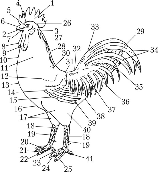 4 – темя; 5 – лоб; 6 и 7 – клюв (надклювье и подклювье); 8 – сережки; 9 и 10 – горло и шея; 11 – грива; 12 – малые кроющие перья; 13 – грудь; 14 и 15 – перья крыла; 16 и 17 – голень;