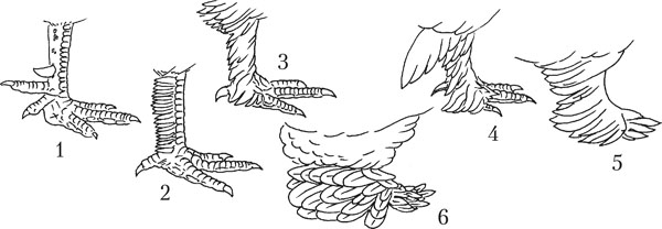 Цевки кур: 1 – гладкая пятипальцевая цевка; 2 – цевка с редким «чулочком»; 3 – цевка с густым «чулочком»; 4 – «штаны» – удлиненные кроющие перья голени; 5 – среднемохноногая цевка; 6 – сильномохноногая цевка