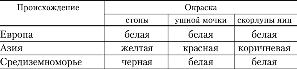 В процессе одомашнивания и разведения кур были созданы разнообразные породы. В настоящее время кур классифицируют по хозяйственных признакам. Исходя из этого, различают: яичный, мясной, мясо-яичный, бойцовый и декоративный типы кур. С учетом разведения и племенного отбора кур породы подразделяют на группы: азиатские, средиземноморские, европейские. Для установления происхождения птицы можно ориентироваться на окраску ног (стопы), ушной мочки, скорлупы яиц (табл. 2).
