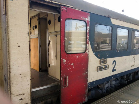 Состав состоит всего из четырех вагонов первого и второго классов. Номер класса написан крупно у двери вагона. Во втором классе – кожаные драные сиденья, в первом – сиденья тканевые, тоже драные, но стоят пошире друг от друга. В поезде есть вонючий туалет, но нет кондиционера.