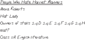 Alexa ignores me. “So I think it’s time we put it to the test,” she continues and then she looks around the room. I can feel my eyes filling up with water, but I’m totally frozen. Even my tongue feels numb. “Who in this room,” Alexa says slowly and loudly, “hates Harriet Manners? Put your hand up.”