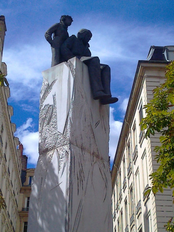 Зато архитектурное сооружение на площади Якобинцев, которое мы хорошо видели из кафе, поедая траву с макаронами, не оставило нас равнодушными. Это великолепный памятник-фонтан с надписью: «От Лиона тем, кто его создавал». Он запечатлел выдающихся мастеров-горожан Лиона, вложивших свой труд в создание этого богатого, живописного города в разные исторические эпохи.