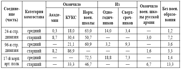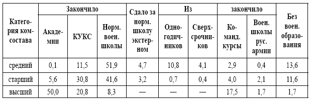 – либо ускоренный курс нормальной военной школы (к этой категории следует отнести и бывших офицеров русской армии производства 1915–1917 гг. – прошедших лишь 4-, 6- или 8-месячный ускоренный курс военного училища либо 3—4-месячный курс школы прапорщиков),