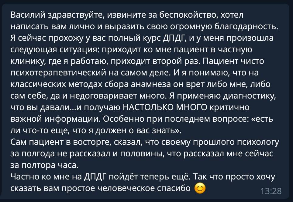 И если будешь честен до конца, то это приведет тебя к ДПДГ. Потому что в НЛП и медитациях ты иногда будешь утыкаться в травмы. В НЛП ты их просто не сможешь отработать, а в медитациях это будет весьма долго. И если тебе нужна скорость (а у тебя не бесконечная жизнь, чтобы иметь в запасе несколько лет на проработки травм прошлого, отравляющих твое настоящее), ты изучишь и полюбишь ДПДГ.