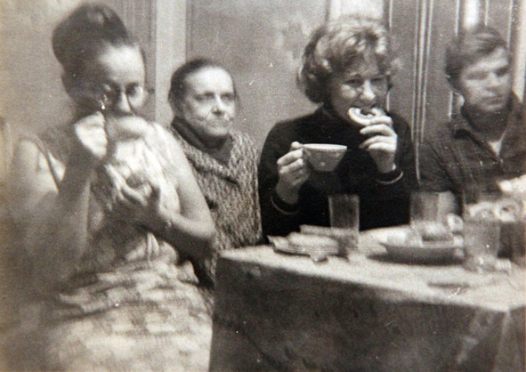Лукьяновка, 1968 год. Слева направо: мамина сестра Клавдия Петровых, мамина мама, моя бабушка Мария Федоровна Петровых, коллега по работе Нина Скрипа, папа