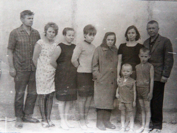 Слева направо: папа, мама, Клавдия Петровых, Мария Петровых, Мария Федоровна Петровых, Тамара Хазова, ее муж Борис Хазов, на переднем плане их дети Александр и Сергей Хазовы. Лукьяновка, 1969 год