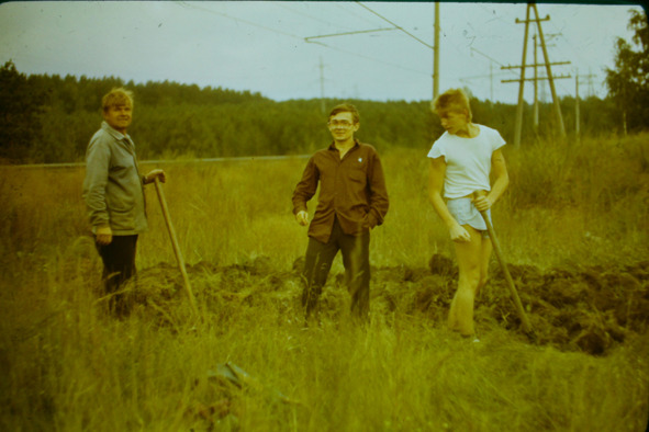 Большим сюрпризом стал обнаруженный среди слайдов забытый кадр: папа, я и Олег напротив дачи, середина мая 1986 года