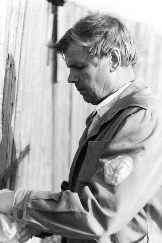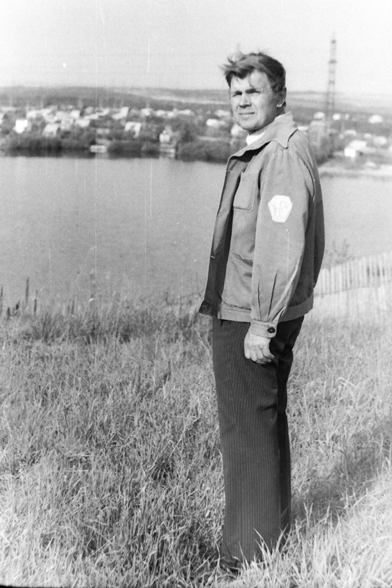 Сфотографировал папу перед отправлением домой, сзади расположено наше дачное озеро, 1986 год