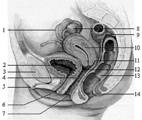 Женские внутренние органы в области таза. 1 – фаллопиевы трубы; 2 – мочевой пузырь; 3 – лобковая кость; 4 – G-точка; 5 – клитор; 6 – уретра; 7 – влагалище; 8 – яичник; 9 – сигмовидная кишка; 10 – матка; 11 – задний свод влагалища; 12 – шейка матки; 13 – прямая кишка; 14 – анус.
