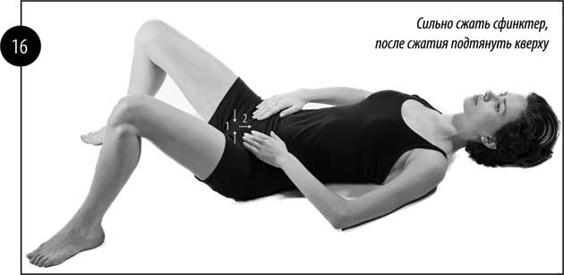 «Жим»В исходном положении лежа на спине, руки положите на низ живота, ноги слегка согнуть и немного раздвинуть в стороны. Начинаем довольно сильно сжимать сфинктер влагалища на счет (один, два, три… до 100), как это показано на рисунке 16. Постараться делать одно сжатие – одна секунда. После сжатия сфинктера делайте подтяжку кверху. У вас должно получиться 100 сжатий с подтяжкой кверху. Сделали первый подход, отдохнули 30 секунд. Второй подход: увеличьте скорость. Количество сжатий тоже 100, но уже без подтяжек кверху. Частота сокращений вашего сфинктера должна быть не менее чем 2 раза в секунду, то есть за 1 секунду ваша мышца должна сократиться в 2 раза. Ни о каких подтяжках кверху не может быть и речи. Представьте, что при выполнении первого подхода вы спокойно и уверенно идете, а при выполнении второго подхода бежите.