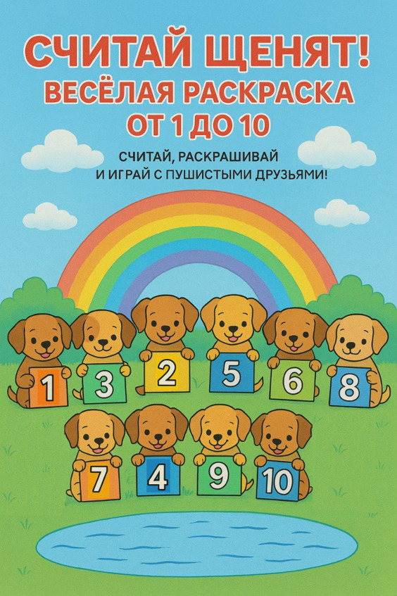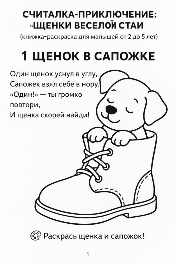 СЧИТАЛКА-ПРИКЛЮЧЕНИЕ: «ЩЕНКИ ВЕСЕЛОЙ СТАИ» (книжка-раскраска для малышей от 2 до 5 лет).1 Щенок в сапожке.