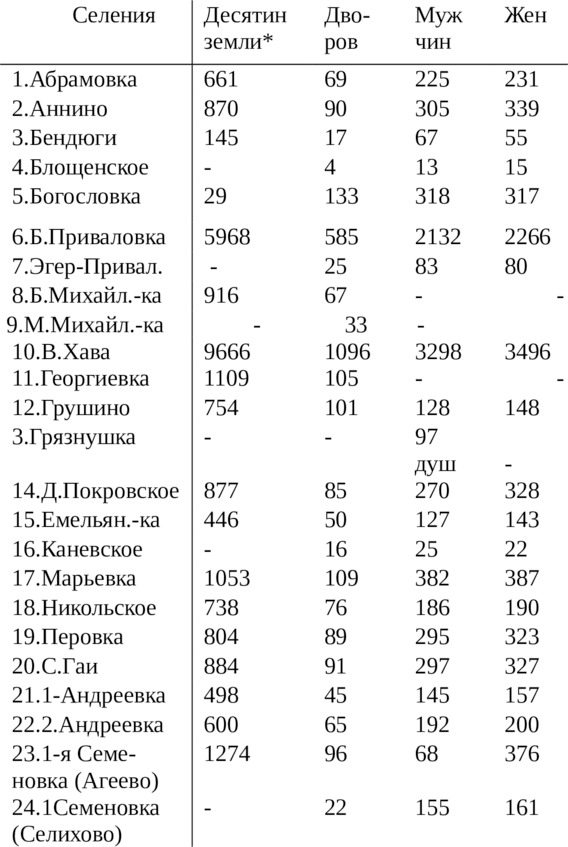 В. Хавское. Села и деревни: (1-я Семеновка (Агеево, Селихово), Черняхи, Тонкое, В. Хава, Емельяновка, Аннино, Грушино, Грязнушка, Канево, Богословка). Всего: 11988 едоков.