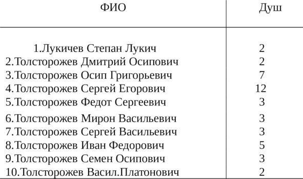 2.Щеголев Василий Павлович-53.Щеголев Евдоким Акинтьевич-44.Щеголев Семен Дмитриевич-45.Щеголев Яков Акинтьевич-36.Щукин Кирилл Тимофеевич-6Я.1.Яковлев Иван Александрович-82.Яковлев Михаил Семенович-23.Яковлев Тихон Семенович-84.Яковлев Родион Федорович-105.Яковлев Тихон Алексеевич-56.Яковлев Тихон Федорович-4Жители деревни Бендюги (украинские переселенцы):Бащенко Исаак Никифорович, 1865 г.р.Кузьмина Мария ГригорьевнаБащенко Василий Исаакович, 1902 г.р.Бащенко Зинаида Арсентьевна, 1904 г.р.Бащенко Алексей ВасильевичБащенко Вера ИсааковнаБащенко Влас Никифорович, 1871 (?) г.р.Бащенко Мария Захаровна 1872 г.р.Бащенко Михаил ВласовичБащенко Петр ВласовичБащенко Евдокия ВасильевнаБащенко Иван Власович, 1893 г.р.Бащенко Александр ИвановичБащенко Вера ИвановнаБащенко Карп Власович, 1900 г.р.Бащенко Марина Власовна, 1904 г.р.Бащенко Агния Власовна, 1912 г.р.Бащенко Венедикт НикифоровичБащенко Евдокия Кирилловна 1882 г.р.Бащенко Федор Венедиктович, 1895 г.р.Бащенко Владимир ВенедиктовичБащенко Борис ВенедиктовичБащенко Вера ВенедиктовнаБащенко Анна ВенедиктовнаБащенко Ал-др Венедиктович, 1913 г.р.Бащенко Мария ВенедиктовнаБащенко Доминика Нестеровна, 1886 г.р.Бащенко Ефросинья СтепановнаБойченко Яков ТарасовичБойченко Дарья Ивановна 1865 г.р.Бойченко Константин Яковлевич, 1898 г.р.Бойченко Фекла Васильевна, 1900 г.р.Бойченко Зинаида ЯковлевнаКозуб Владимир ГригорьевичКозуб Елена (его жена)Козуб Александр Владимиров.,1903 г.р.Козуб Владимир ВладимировичКозуб Василий ВладимировичКозуб Кирилл ВладимировичКозуб Анастасия ВладимировнаКозуб Валентин КирилловичКозуб Феодосия АндреевнаКозуб Михаил СеменовичМинченко Федор Семенович, 1886 г.р.Минченко Евдокия Мак., 1889 г.р.Минченко Агафья Прокофьевна 1873 г.р.Минченко Семен ВасильевичМинченко Василий СеменовичМинченко Феодосия СеменовнаМинченко Раиса ВасильевнаМинченко Эммануил СеменовичМинченко Владимир СеменовичОстролуцкий Семен Даниилович, 1903 г.р.Остролуцкая Мария Федоровна, 1907 г.р.Остролуцкий Владимир СеменовичОстролуцкая Зинаида СеменовнаОстролуцкий Николай ДаниловичОстролуцкая Вера ЕфимовнаОстролуцкий Александр НиколаевичОстролуцкая Анастасия Прохоровна, 1907 г.р.Пелешенко Гаврил СтепановичПелешенко Татьяна (его жена)Пелешенко Владимир Гаврилович, 1887 г.р.Пелешенко Мария Владимировна, 1891 г.р.Пелешенко Евдокия ВладимировнаПелешенко Анастасия ВладимировнаПелешенко Александр ВладимировичПелешенко Раиса ВладимировнаПелешенко Макар Гаврилович, 1901 г.р. (?).Плюта Арсентий Демидович, 1870 г.р.Плюта Прасковья Арсентьевна, 1903 г.р.Плюта Наум АрсентьевичПлюта Иван АрсентьевичПлюта Василий АрсентьевичПлюта Елизавета АрсентьевнаПлюта Семен АрсентьевичПлюта Абрам Арсентьевич, 1898 г.р.Пономаренко Артем Васильевич, 1883 г.р. (?).Пономаренко Ульяна Петровна, 1899г.р.Пономаренко Надежда Васильевна, 1896 г.р.Пономаренко Василий МиновичПономаренко Ефрем Васильевич, 1900 г.р.Рыбак Михаил Тимофеевич, 1863 г.р.Рыбак Оксана (его жена)Кочина Екатерина ВладимировнаРыбак Роман Михайлович, 1903 г.р.Рыбак Иван МихайловичРыбак Василий МихайловичРыбак Анастасия МихайловнаРыбак Наталия МихайловнаРыбак Феодосия МихайловнаШтанько Филипп ФедоровичШтанько МаринаШтанько Осип Филиппович, 1880 г.р.Штанько Евдокия (его жена)Штанько Алексей ОсиповичШтанько Петр ОсиповичШтанько Клавдия ОсиповнаШтанько Константин ИвановичШтанько Иван Филиппов