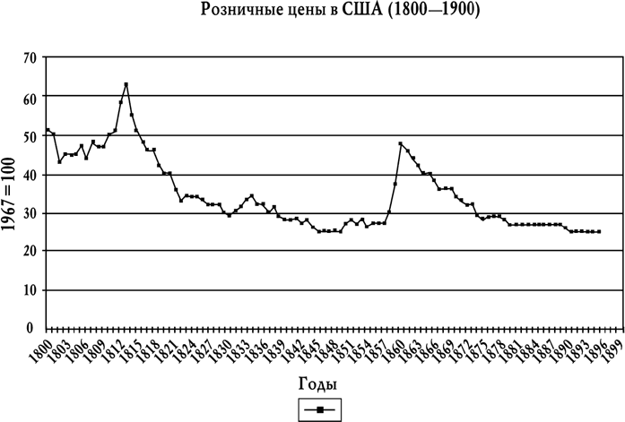 В XVIII веке во времена Смита с характерным для них господством ручной ремесленной техники положение было существенно иным. Тенденция к некоторому понижению стоимости товаров вследствие развития мануфактурного разделения труда не могло пробиться сквозь множество противодействующих ей конъюнктурных факторов колонизируемой экономики США. Поэтому на второй диаграмме мы видим тенденцию к повышению цен (рис. 8).