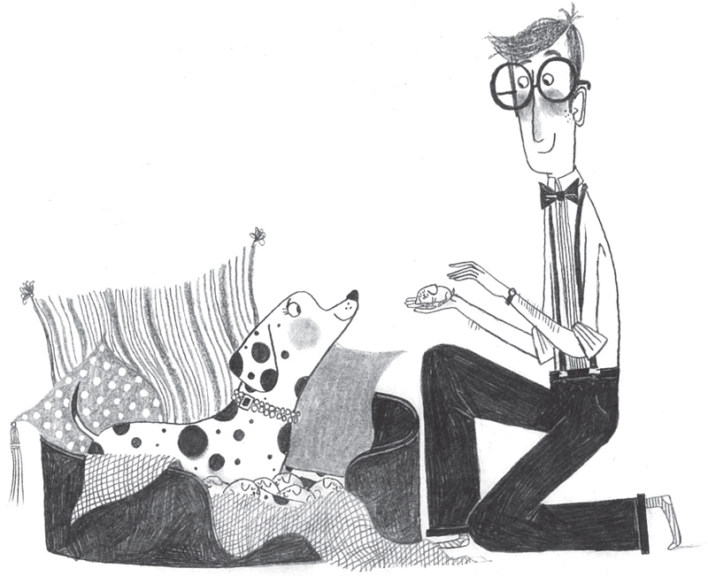‘Poor Pongo, we must have him up,’ said Mrs Dearly. But the Splendid Vet said mother dogs did not usually like to have father dogs around when puppies had just been born. At that moment there was a clatter of toenails on the polished floor of the hall – and upstairs, four at a time, came Pongo. Nanny Cook had just gone down to make some tea for the Splendid Vet, and the anxious father had streaked past her the minute she opened the kitchen door.