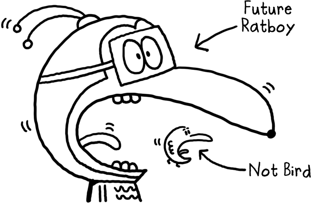 I picked up the phone to tell Bunky and Nancy, then changed my mind, deciding it’d be keeler to see their excited little dog and cat faces face-to-face. After that I played nineteen games of Future Ratboy on my Feeko’s Gamoid to celebrate.