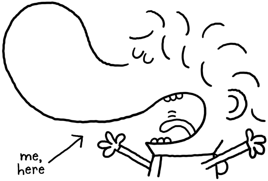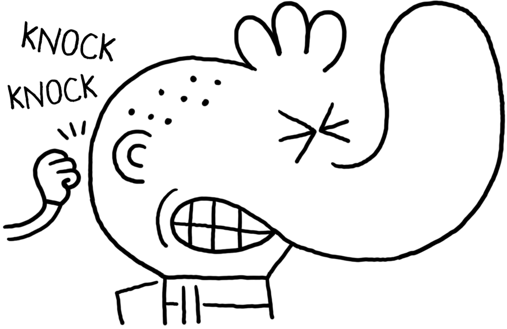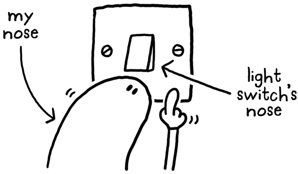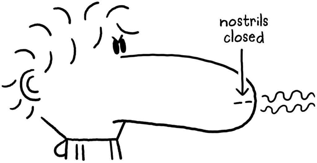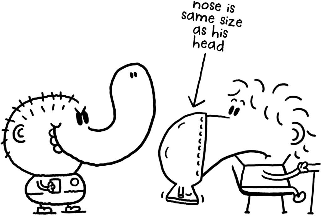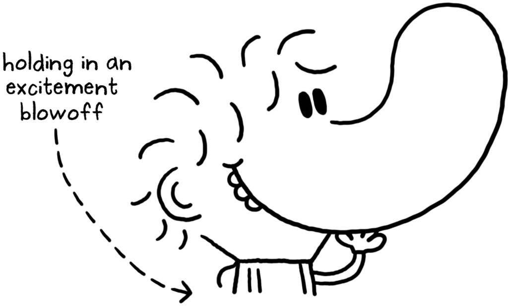 ‘IT’S JUST A NORMAL NOSE!’ I shouted, an excitement blowoff from earlier popping out as an extra-loud annoyance fart, and I turned back to Bunky. ‘HELLO-O?’ I boomed, knocking on his head like it was a front door. ‘ANY-BODY HO-OME?’