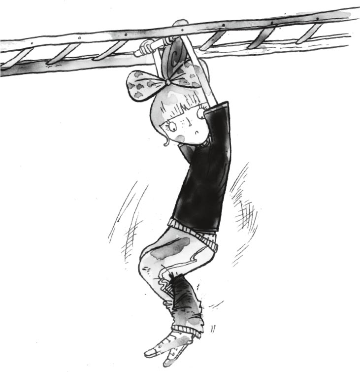 With a yell, she raced through the monkey bars, hurled herself into the pipe, hopped furiously across the tyres and reached the big wall just as Plum was disappearing over it.