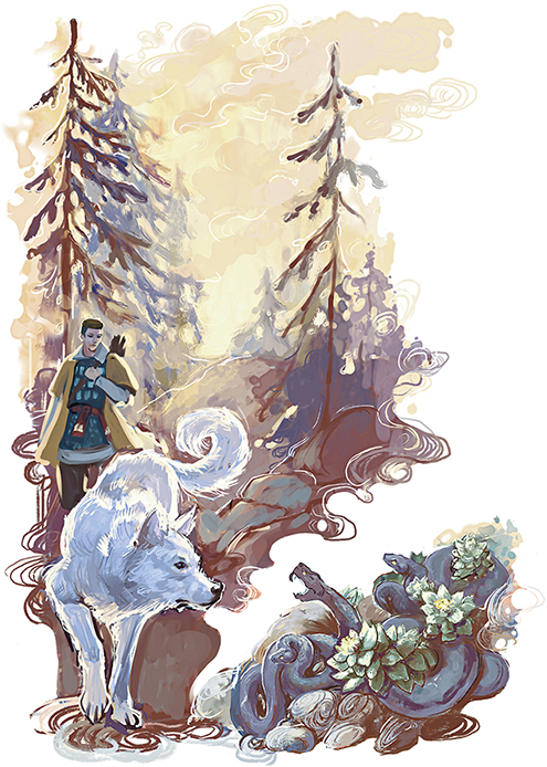 Поблагодарил Камыр-батыр старушку и пошел Акбая выручать от чар. Всё так и произошло, как старушка говорила. Вода чары сняла, и горы отпустили пса. Идут дальше вдвоем: Акбай рядом семенит, по сторонам внимательно поглядывает. Вдруг резко прыгает в сторону. Стоит, что-то внимательно рассматривает. Затем тихонько заскулил. Подошел Камыр-батыр, а там цветок красы невиданной. Но вокруг него змеи разные вьются, головы к юноше повернули. Кажется, вот-вот ужалят.
