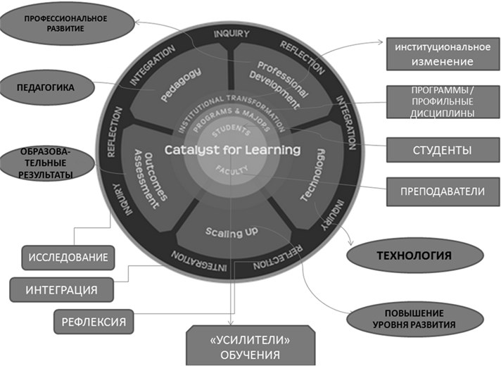В зарубежной практике активно ведутся исследования по осуществлению перехода от процедур оценивания к изменениям, которые совершенствуют сам процесс обучения. В качестве примера приведем контент веб-сайта «Катализатор». В соответствии с его концепцией технология е-портфолио способствует развитию инициатив изменения образования в отношении новых методов измерения образовательных результатов согласованных с образовательной системой учреждения [73]. На рис. 1.2 показаны меры по усилению воздействия на изменение образования в отношении новых методов измерения образовательных результатов.