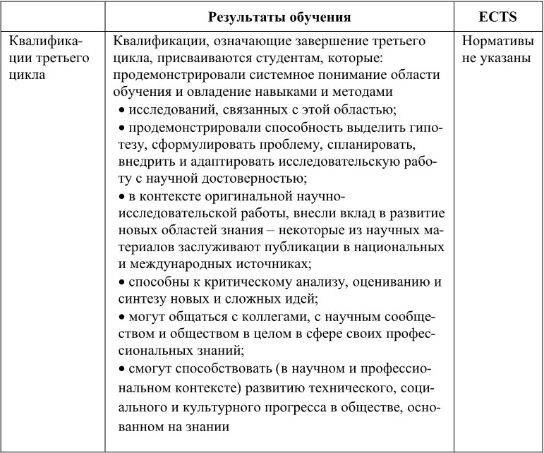 Результаты обучения по завершению третьего цикла обучения в рамках квалификации ЕРК