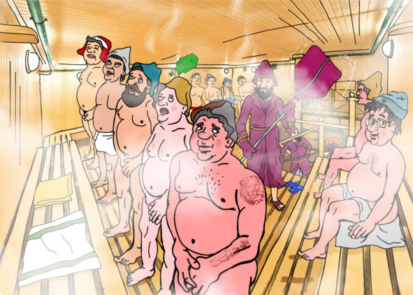 В парной собираются любители разной температуры, прикидывая, где им будет лучше, в каком месте пристроиться.