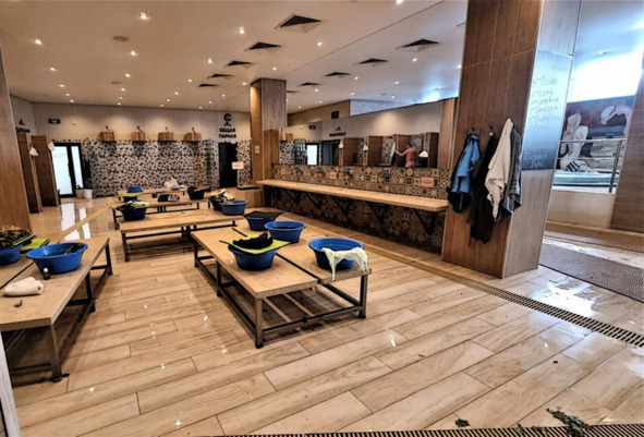 Что характерно для таких больших залов, так это то, что не всегда можно встретить удобство, где да как расположить свой парильный инструмент – веник. Здесь это предусмотрено вполне логично и практично.